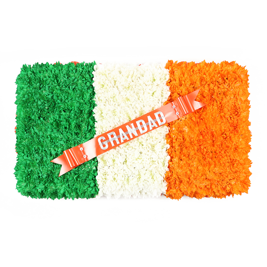 This briliantly beautiful arrangement designed in the shape of the Ireland flag will create a glorious sense of peace. Pay your last respect and express your deep sorrow with this tribute made up of green,white and orange chrysanthemums.