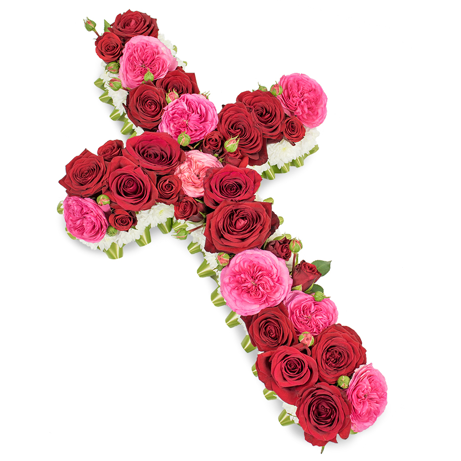 Express your heartfelt emotions with this distinctive cross-shaped arrangement. Crafted with passion, this luxurious bouquet features white chrysanthemums, red roses, and pink garden roses that radiate beauty and serenity, making it an ideal gift for moments of remembrance and respect.