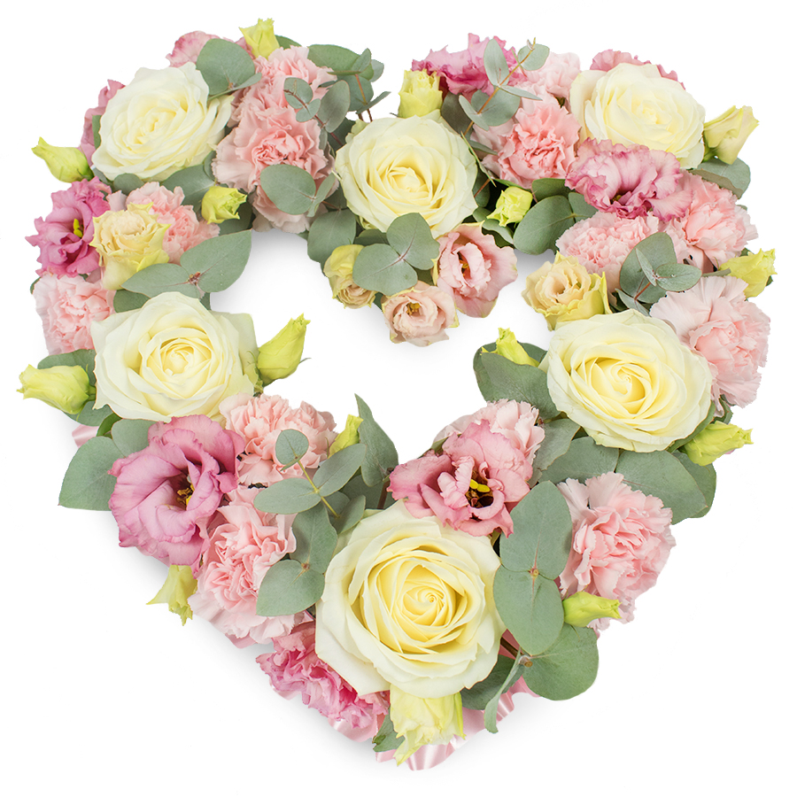 Convey your deepest emotions with our Luxurious Heart Tribute bouquet. This elegant arrangement showcases an exquisite blend of white roses, pink carnations, pink lisianthus, and rich Eucalyptus leaves, thoughtfully arranged to symbolize love and remembrance.
