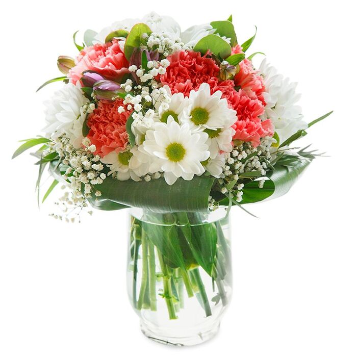 A lively burst of coral and peach tones shines from this beautifully arranged bouquet, evoking the cheerful, close-knit spirit of Tottenham's communities. Each carnation is fluffed and vibrant, its ruffled petals shimmering with gentle peach and red hues that conjure up images of local Tottenham allotments in full summer bloom. Bright white daisies peek from between the carnations with sunlit yellow-green centres, bringing a smile to the display, while trace amounts of dreamy baby's breath add a softness that floats between each flower. Large, polished green leaves wrap the base in lush arcs, creating a cradle of foliage that anchors the arrangement and enhances its fullness. On the left, small purple-tinged buds offer a promise of new beginnings-a detail reflecting the ever-growing energy of Tottenham. The bouquet is expertly nestled inside a minimal white gift bag with elegant handles, ready for same-day delivery, whether to homes near Bruce Grove or one of Tottenham's lively cafés. Gentle, natural lighting highlights the bouquet's radiant colours and crisp textures, giving it an uplifting and sincere mood-perfect for birthdays, milestones, or simply to send good cheer across the area. Every element, from each stem to each petal, comes together in a display of careful local craftsmanship and the joy of thoughtful gifting. This jubilant bouquet, artfully arranged by a Tottenham florist, captures the energising spirit of North London's vibrant streets. At its heart, pure white daisies unfurl around lively lime-green centers, evoking the clarity of early sunlight filtering through the trees of Tottenham Marshes. These sit entwined among plush, coral-pink carnations, whose layered, ruffled petals radiate warmth and comfort. Sprigs of delicate baby's breath seem to float between the larger blooms, creating an ethereal, almost weightless effect, while slim, unopened alstroemeria buds edged with hints of pink and purple quietly promise new beginnings. The arrangement is anchored by varied greenery-a tactile blend of soft eucalyptus and deep, glossy foliage forming a balanced round composition that echoes Tottenham's diverse, welcoming community. Designed for milestone occasions or spontaneous acts of kindness, this bouquet, available for swift delivery throughout N17, brings a tranquil yet exuberant presence to any setting, offering a little slice of Tottenham's liveliness and heart with every petal. Radiating the gentle optimism of a sunlit Tottenham morning, this bouquet is a harmonious blend of freshness and understated elegance-effortlessly capturing the spirit of North London's diverse gardens. At its centre, fluffy coral-pink carnations burst upward, their ruffled forms brimming with energy and positivity. Intertwined are crisp white daisies, their lively green centres shining like cheerful beacons and evoking the sights along Bruce Castle Park on a spring day. Tiny clouds of baby's breath weave softly through the bouquet, enriching the soft textures and lending a dreamy, airy feel. Sprigs of slender, magenta-tinged alstroemeria buds peek discreetly from the edge, introducing a layer of colour as varied and vibrant as Tottenham itself. The entire composition is cocooned by deep green leaves-some broad and lustrous, others fine and tender-adding both boldness and gentle support. Arranged in a clear glass vase flooded with pure water, the sturdy green stems are as visible as the steady roots of Tottenham's close-knit community. Every flower is selected and placed with care by local experts, their craft evident in how seamlessly colours, forms, and textures come together. Whether gracing a dining table near Philip Lane or sent as a heartfelt thank you across N17, this bouquet brings hope, celebration, and a lasting sense of local delight.